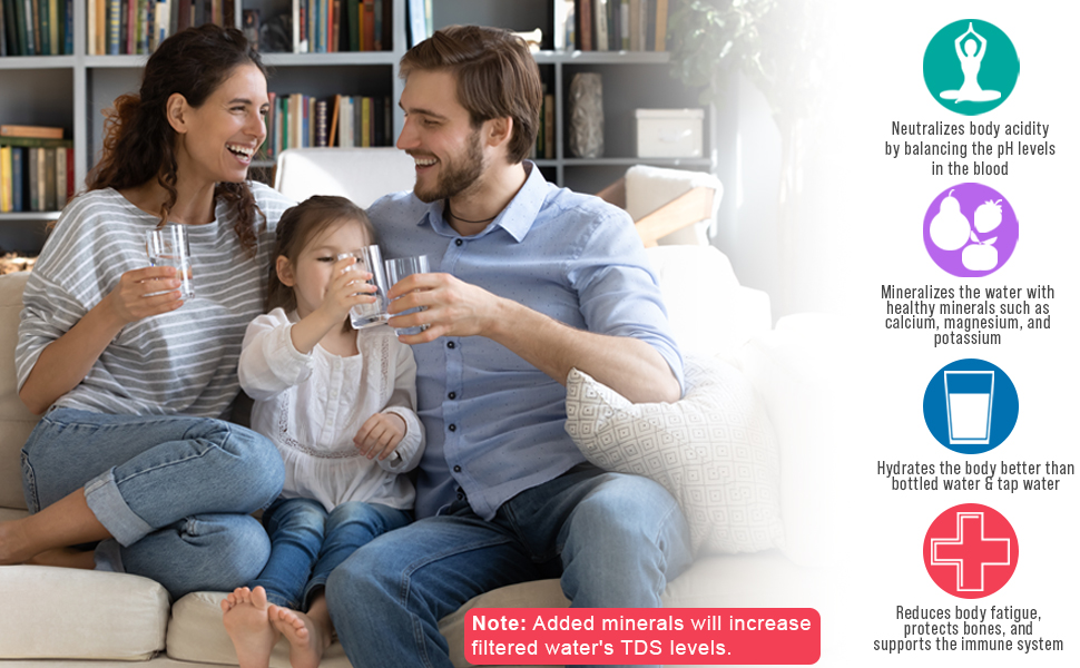 - pH+ Alkaline Water: Remineralizes the water to restore essential minerals that are lost during the filtration process, making it alkaline and improving its tasteand health benefits.